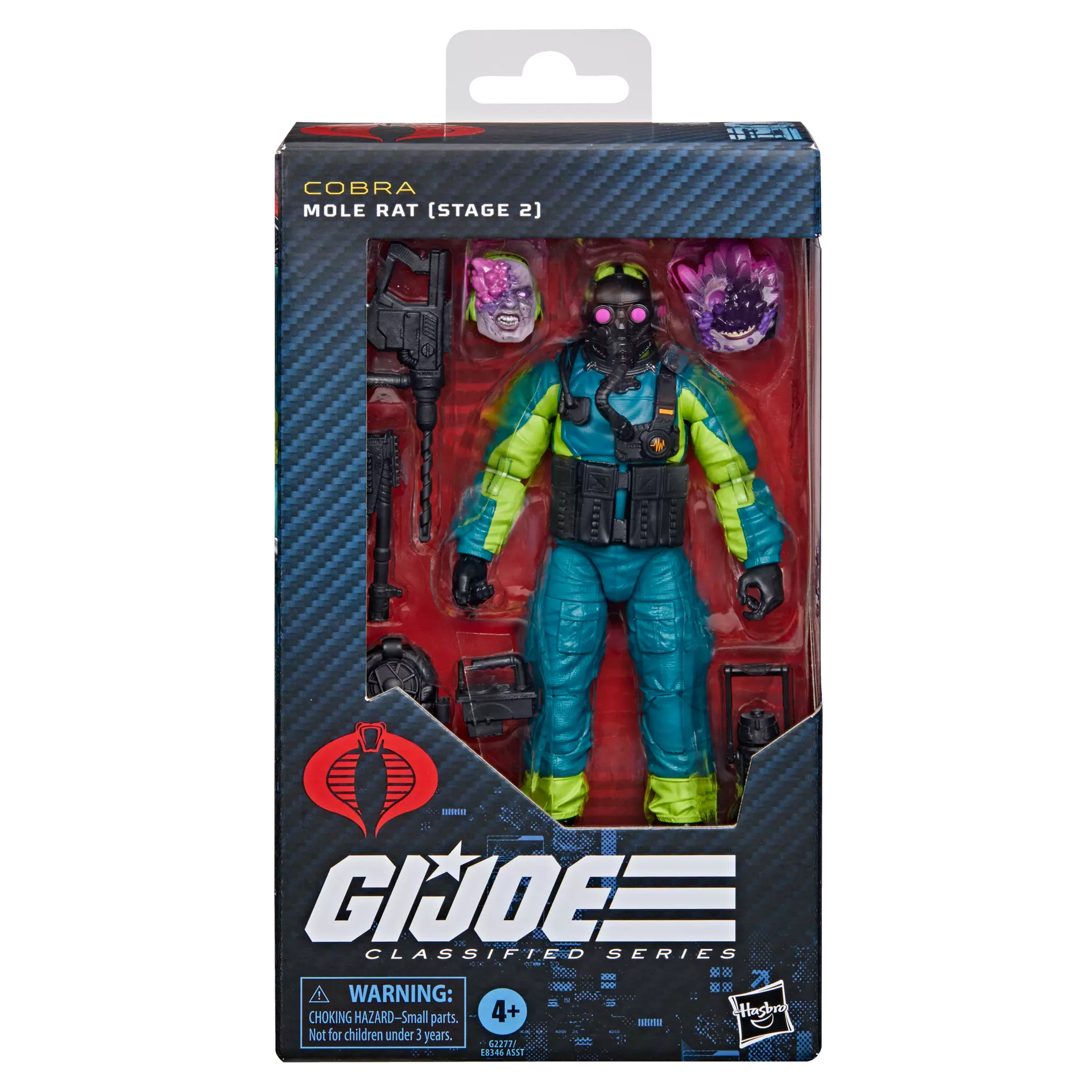 Mole Rat (stadio 2), nuovo arrivato nella linea G.I. Joe Classified Series, è sempre pronto per l'avventura grazie ai diversi punti di snodo per assumere varie pose d'effetto. Questa action figure di un Mole Rat contiene 8 accessori ispirati al personaggio, tra cui zaino, scanner, contenitore di Dark Energon, 2 teste alternative mutate, un trapano a grilletto e un accessorio arma. I Mole Rats, i soldati sacrificabili per la scienza dei Cobra, continuano a estrarre depositi di Dark Energon instabile, una fonte di energia per alimentare la macchina da guerra dei Cobra. L'esposizione prolungata ha trasformato alcuni trooper in esseri senza cervello, determinati a distruggere tutto ciò che incontrano sul loro cammino, e lo stadio 2 dell'infezione non ha fatto altro che accelerare la loro degenerazione.