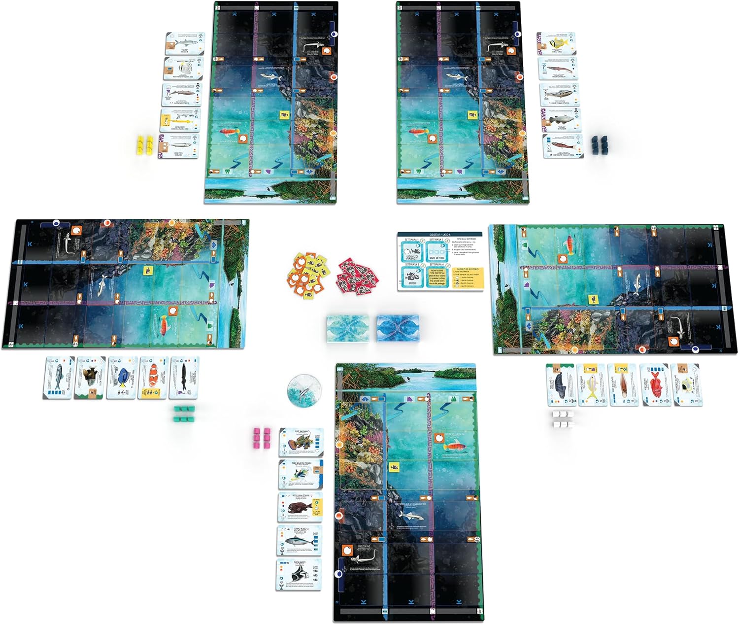 Al tuo turno, gioca una carta pesce, collocandola nella zona appropriata, oppure usa uno dei tuoi sommozzatori per esplorare un sito di immersione e attivare tutte le abilità in esso (provenienti dalla plancia e dai pesci). Fai deporre uova, falle schiudere generando degli avannotti, e cerca di unirli in banchi in modo che possano crescere sani e forti. Soddisfa i diversi obiettivi durante le 3 settimane di gioco, e diventa il biologo marino più stimato dei sette mari.
