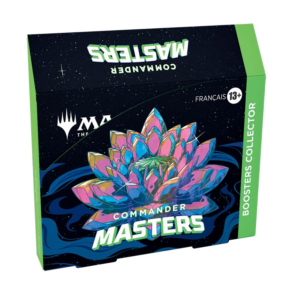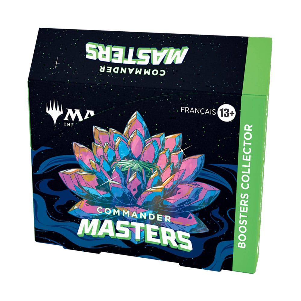 The Commander Masters Collector Booster Box contains 4 Commander Masters Collector Boosters. Each Collector Booster contains 15 Magic: The Gathering cards and 1 Traditional Foil double-sided token, with a combination of 5 cards of rarity Rare or higher and 2-5 Uncommon, 4-7 Common, and 1 Land cards.