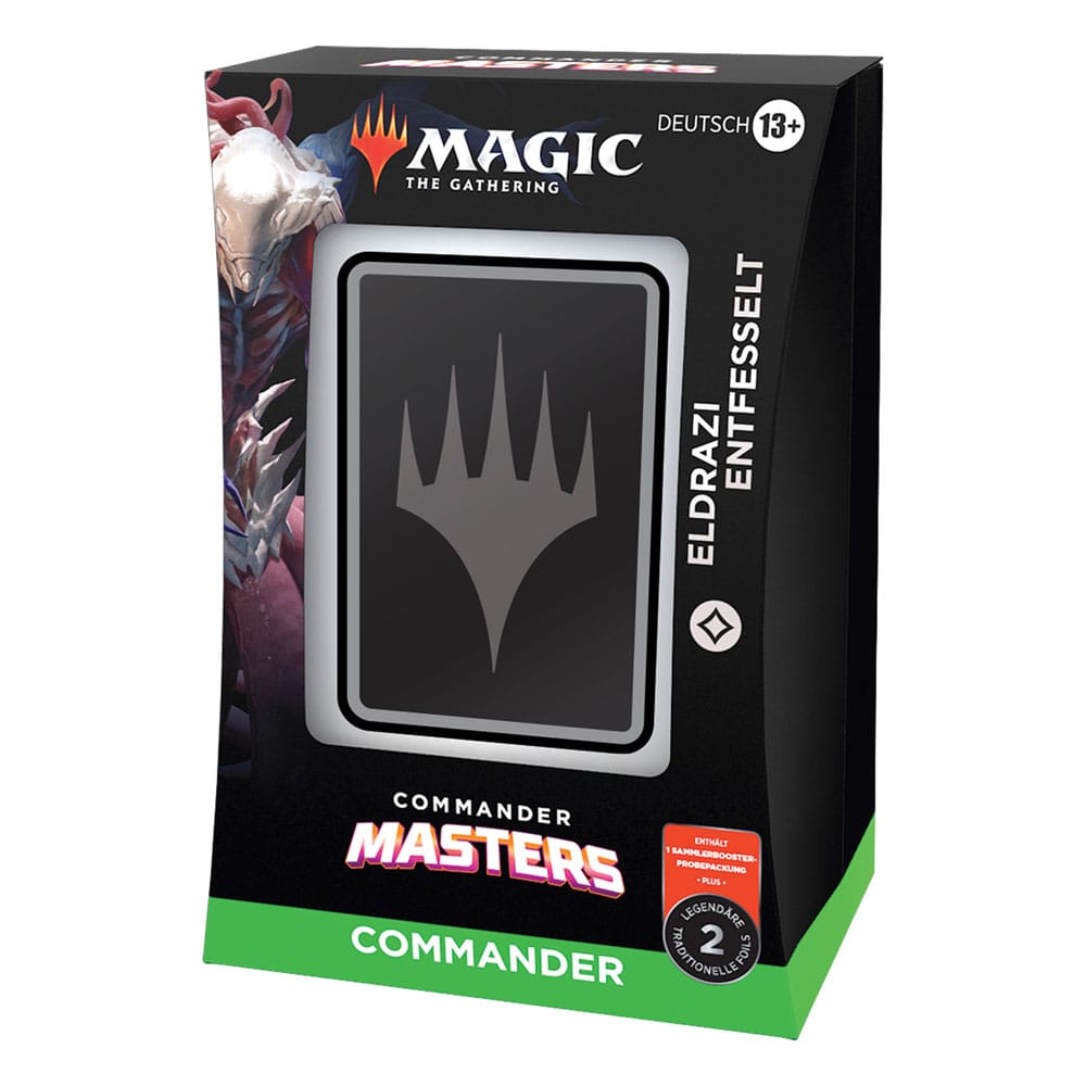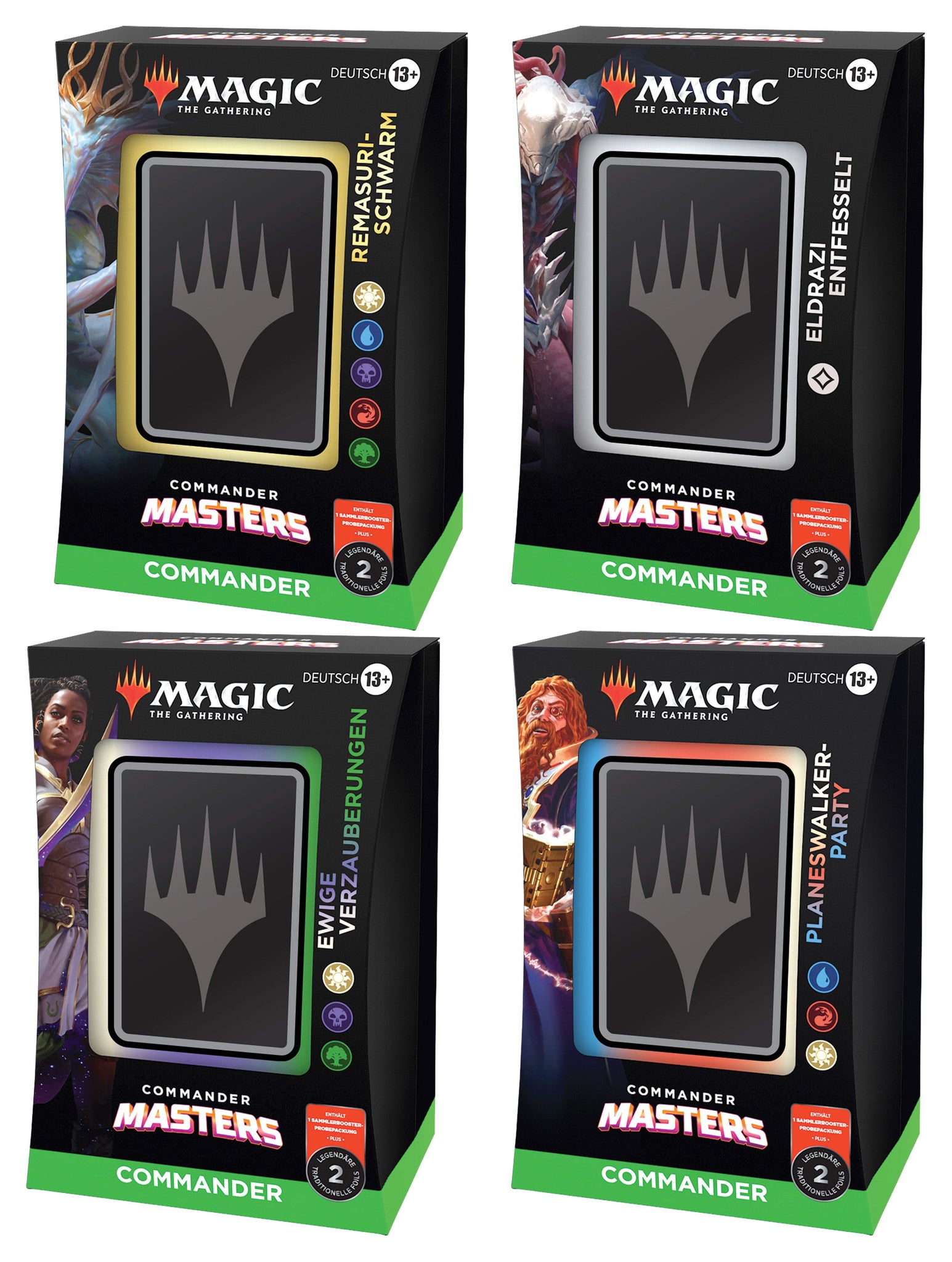 Each Commander Masters Commander Deck set includes 1 ready-to-play deck of 100 Magic cards (2 Traditional Foil Legendary Creature cards, 98 nonfoil cards), a 2-card Collector Booster Sample Pack, 1 foil-etched Display Commander (a thick cardstock copy of the commander card with foil etched into the card's border and art), 10 double-sided tokens, 1 deck box (can hold 100 sleeved cards), 1 Life Wheel, 1 strategy insert, and 1 reference card.
