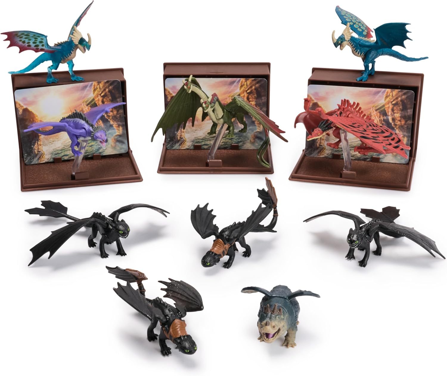 Muscolone, Sdentato, Tempestosa, Corno Tonante, Tagliaboschi, Uncinato, Incubo, Skrill, Orribilante e Morte Sussurrante in scala 5cm. Con confezione a forma di Libro dei Draghi e carta da collezione.