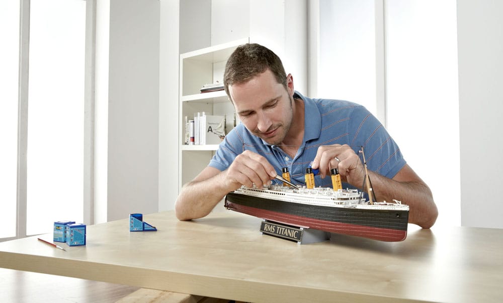 This gift set comes in an informative special pack for the "Titanic Centenary". In addition to the plastic model kit to scale 1:400, this exclusive set includes 6 basic colours, a brush and adhesive. Special inserts are enclosed showing original reproductions of historical documents. These are: 3 post cards, a first class menu, a 28-page publicity brochure for the White Star Line. - Structurally detailed hull with decking - Three marine screws - Separate rudder - Detailed decks with timber plank structure - Detailed deck superstructure - Life boats and davits - Separate railings - Derricks - Detailed funnels - Stairways - Detailed masts - Display stand - Detailed decals with decorative stripes In addition to basic colours, adhesives and brushes are also included. 1:400 scale model kit with 262 pieces. Length of fully assembled model = 670 mm