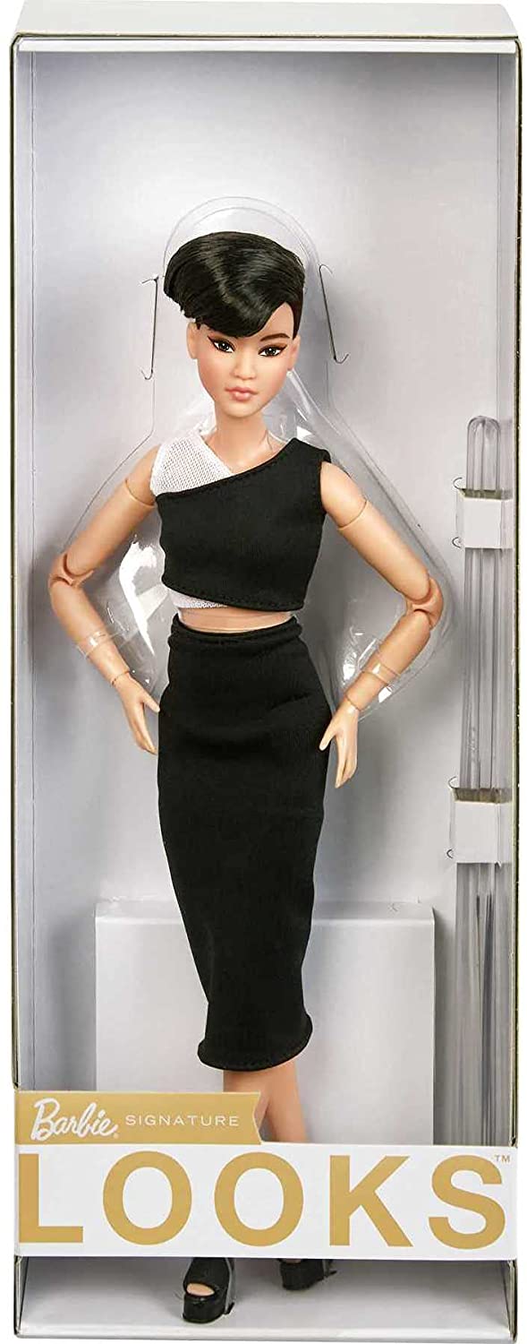 Questa bambola Barbie Looks ha lineamenti del viso unici e sfoggia un elegante taglio corto rasato ai lati.