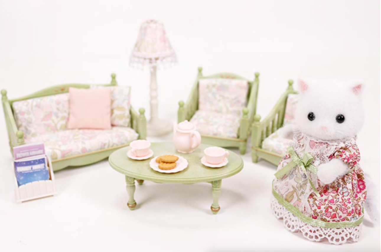 Un salotto in miniatura per casa delle bambole. La mamma Gatto Persiano si sistema comodamente sul divano. Le poltrone accolgono gli ospiti per il tè. La lampada fiorita illumina la stanza calorosamente. La teiera e le tazze aspettano sul tavolo, accompagnate da deliziosi biscotti. Il salotto e la mamma Gatto Persiano sfoggiano un adorabile motivo Liberty per portare la primavera nelle case Sylvanian Families ! Questo set è ideale per arredare le case delle Sylvanian Families con i suoi graziosi colori bianco e verde che si abbinano perfettamente al motivo Liberty. Si compone di un salotto con 2 poltrone e 1 divano molto comodi, oltre a un'adorabile lampada con paralume fiorito. Piccoli accessori completano il tutto: 1 teiera, 2 tazze con i loro piattini, alcuni biscotti per la merenda e persino 2 riviste per pomeriggi di lettura comodamente installati. La mamma Gatto Persiano è inclusa e indossa un abito Liberty con numerosi dettagli. È articolata e i suoi vestiti possono essere messi e tolti a piacimento. L'arredamento in miniatura perfetto per qualsiasi casa delle bambole Sylvanian Families.